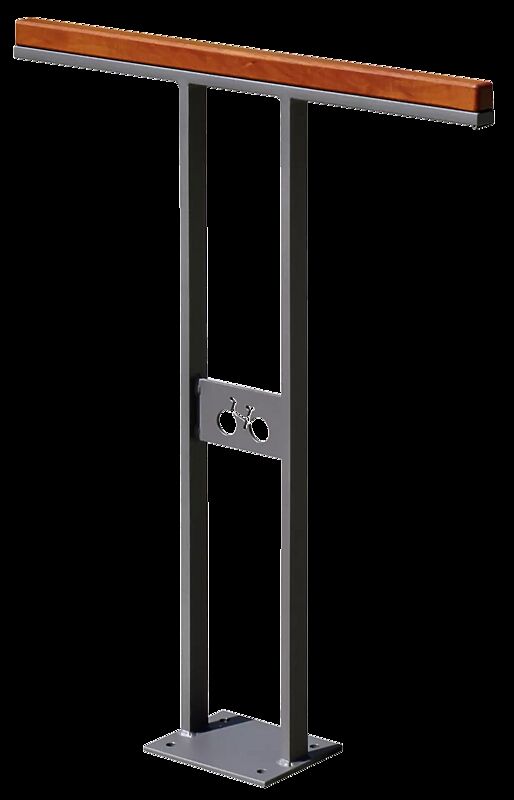 Anlehnbügel aus Vierkantstahl (35 x 15 mm) und einem Quersteg mit gelasertem Fahrradsymbol. Durch Sapeli-Holzlatte (35 x 35 mm) rahmenschonend. Befestigungsmaterial siehe Zubehör.