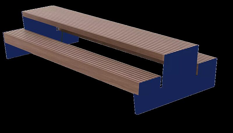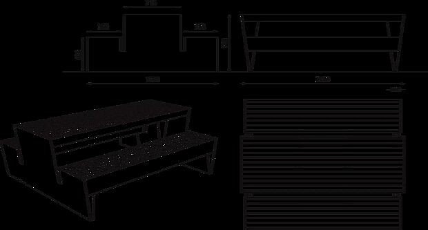 Bank-Tisch-Kombination mit Seitenteilen aus Flachstahl. Bestehend aus 2 Sitzbänken ohne Rückenlehne und Tisch. Sitz- und Tischauflage mit Holzbelattung. Unsichtbare Bodenbefestigung mittels Gewindestangen zum Einbetonieren (nicht im Lieferumfang enthalten). Zum Aufdübeln mittels sichtbarer Bodenbefestigung auf Anfrage erhältlich.