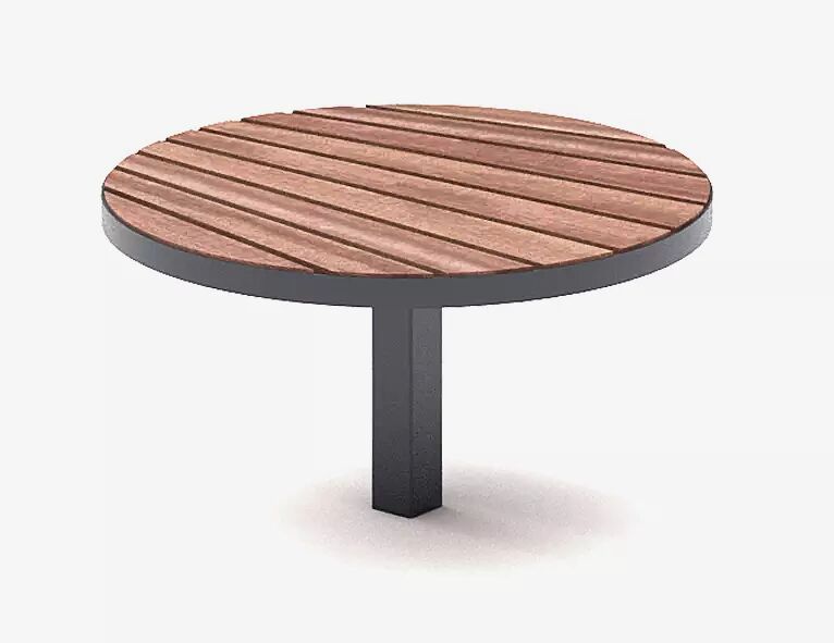 Sitz mit einer Unterkonstruktion aus Stahl. Sitzfläche mit strahlenförmig angeordneter Holzbelattung. Die Belattung wird mit Edelstahlschrauben an der Unterkonstruktion befestigt. Befestigungsmaterial nicht im Lieferumfang enthalten.