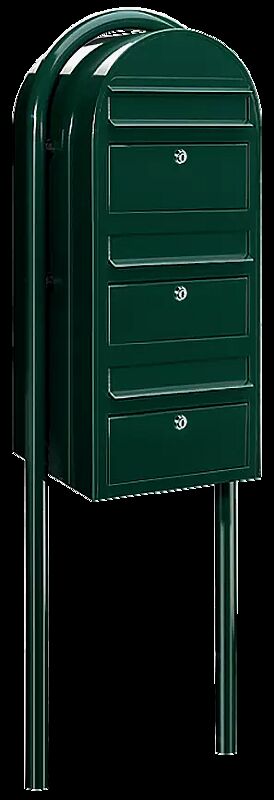 Stilvoller Briefkasten für Mehrfamilienhäuser. Standardmäßig mit Bogenständer BOBI ROUND (Ø 38 mm) aus Stahl zum Einbetonieren (Gesamthöhe 1650 mm, empfohlene Einbautiefe 400 mm). Verriegelung mittels Zylinderschloss, Lieferung inkl. 3 Schlüssel. Einwurfklappen lassen sich schnell und leicht gegen Knallkörper verriegeln (kundenseits mittels Schraube).