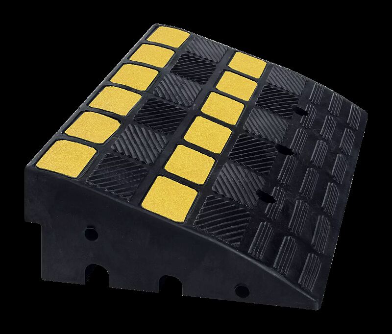Bordsteinrampe (Normelement) aus robustem Hartgummi. Aussparungen an der Unterseite ermöglichen das Abfließen des Regenwassers. Die Bordsteinrampe ist bis 40 t überfahrbar. Profilierte Antirutschoberfläche in schwarz mit gelben Reflexstreifen. Aufgrund des Eigengewichtes der Rampe ist eine Befestigung auf dem Boden nicht notwendig. Dauerhafte Fixierung durch integrierte Dübelaufnahme möglich. Befestigungsmaterial nicht im Lieferumfang enthalten.