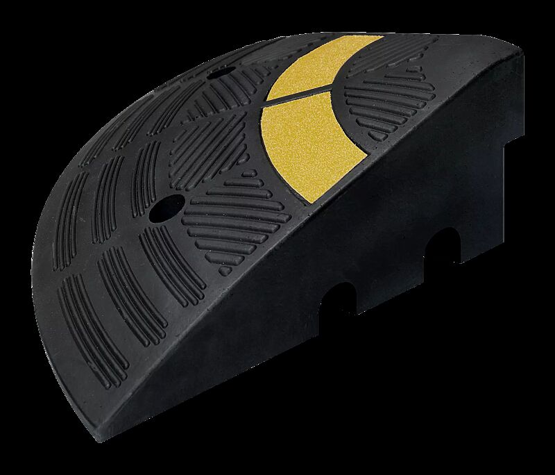 Bordsteinrampe (Abschlusselement) aus robustem Hartgummi. Aussparungen an der Unterseite ermöglichen das Abfließen des Regenwassers. Die Bordsteinrampe ist bis 40 t überfahrbar. Profilierte Antirutschoberfläche in schwarz mit gelben Reflexstreifen. Aufgrund des Eigengewichtes der Rampe ist eine Befestigung auf dem Boden nicht notwendig. Dauerhafte Fixierung durch integrierte Dübelaufnahme möglich. Befestigungsmaterial nicht im Lieferumfang enthalten.