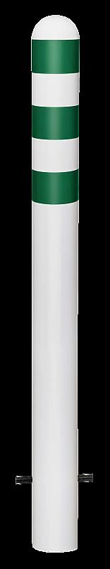 Schutzpoller zum Sichern von E-Ladestationen aus Stahl (Ø 108 mm), Wandstärke 2 mm. Pollerkopf aus Aluminium. Mit 3 Reflexstreifen (je 75 mm hoch) in grün.