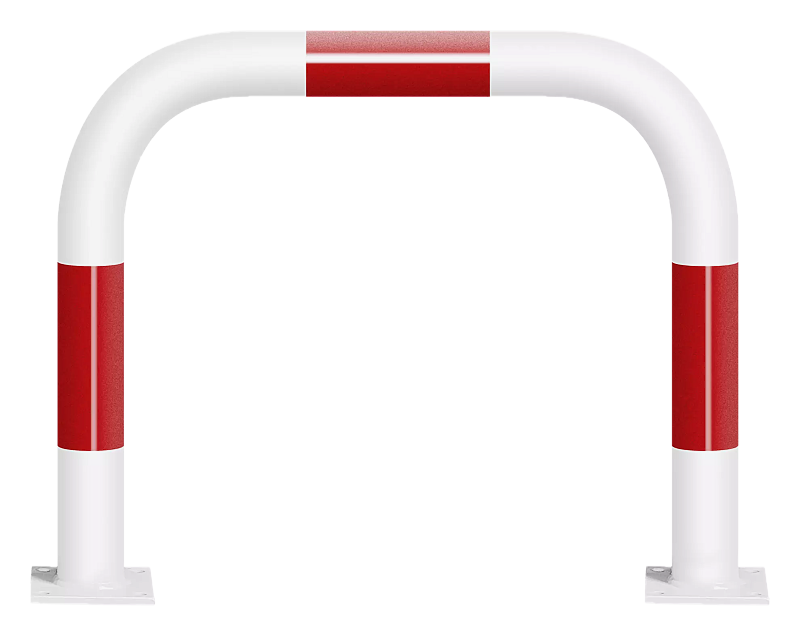 Rammschutzbügel aus Stahlrohr (Ø 76 mm), Wandstärke 3 mm. Zum Aufdübeln mit Bodenplatte (160 x 140 mm).
