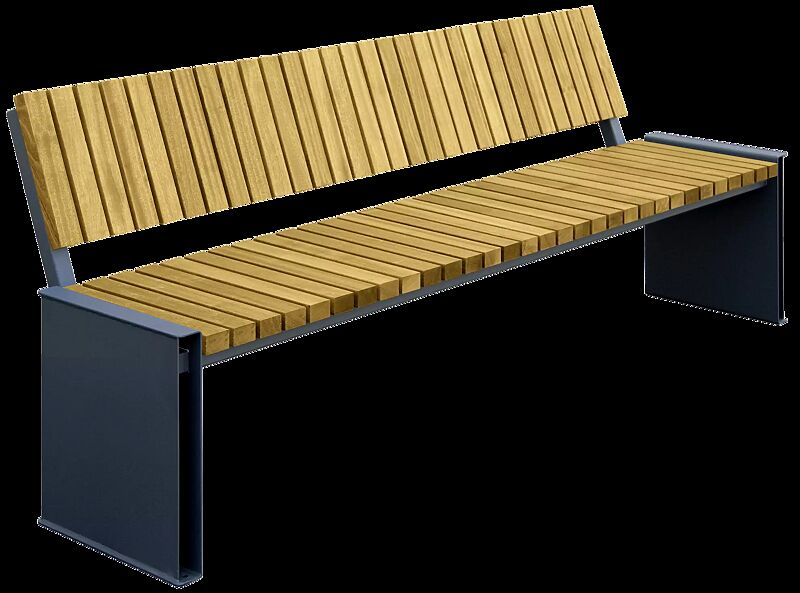 Sitzbank mit kastenförmigen Seitenteilen aus Stahlblech. Sitzfläche und Rückenlehne mit Holzbelattung quer. Holzlatten wetterfest lasiert. Befestigungsmaterial im Lieferumfang enthalten. Anlieferung erfolgt auf Palette.