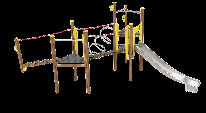 Spielgerät bestehend aus zwei Spieltürmen mit Pfosten und Balken (90 x 90 mm) aus FSC®-zertifiziertem Bilinga-Holz mit verschiedenen Spielmodulen. Mit drei Podesten in unterschiedlicher Höhe, einer geraden Rutsche (Länge 990 mm) mit Rutschöffnung, einer Kletterspirale (Länge 1400 mm) und Haltestangen aus Edelstahl V2A sowie einem Balancierbalken zwischen den Spieltürmen mit zwei Halteseilen als auch einem Kletternetz und -seile aus Nylon mit Stahleinlage. Mit Aufstiegsmöglichkeit durch einen Trittbalken mit Halteseil. Rutschöffnung, Pfostenabdeckungen, Haltegriffe sowie Dekoelemente sind aus gelben HDPE-Kunststoff. Alle Kanten abgerundet. Gerät geprüft nach Euronorm EN 1176. Die Lieferung erfolgt zerlegt auf Palette inkl. Montageanleitung (Entladen bauseits). Für die Entladung vor Ort wird ein Stapler benötigt. Der angegebene Platzbedarf ist inkl. Sicherheitsbereich. Empfohlene Fundamentgrößen: 8 x 300 x 300 x 700 mm, 1 x 300 x 300 x 740 mm