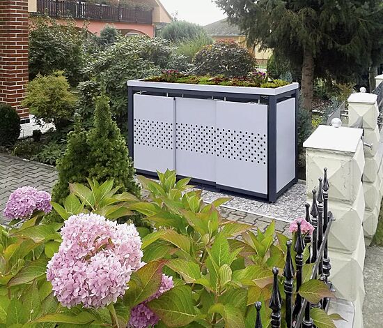 Der Müllbehälterschrank STYLEOUT® QUBIS der Marke DUKIN vereint modernes, elegantes Design mit höchster Qualität. Seine höhenverstellbaren Nivellierfüße ermöglichen einen Niveauausgleich bei etwas unebenen Untergründen. Platzsparende Schiebetüren, 6 verschiedene Größen und viele Farbvariationen machen den Müllbehälterschrank STYLEOUT ® QUBIS zu einem echten Allrounder. Seine quadratgelochten Wand- und Türelemente lassen ihn stilsicher in Erscheinung treten und das auch an räumlich begrenzten Orten. Die Mülltonnenbox ist für 120 oder 240 Liter Mülltonnen geeignet und als Doppel-, Dreifach- oder Vierfachschrank erhältlich. Der robuste Rahmen aus Quadratstahlrohr sorgt für die nötige Stabilität. Um die dekorative Gartenbox auch noch diebstahlsicher zu machen, können die Türen mit einem Schloss gesichert werden. Zur Individualisierung bzw. attraktiven Gestaltung ist der Müllbehälterschrank mit einem Pflanzdeckel ausgestattet. Wird ein Klappdach präferiert, besteht optional die Möglichkeit dieses anstelle eines Pflanzdeckels zu konfigurieren.
